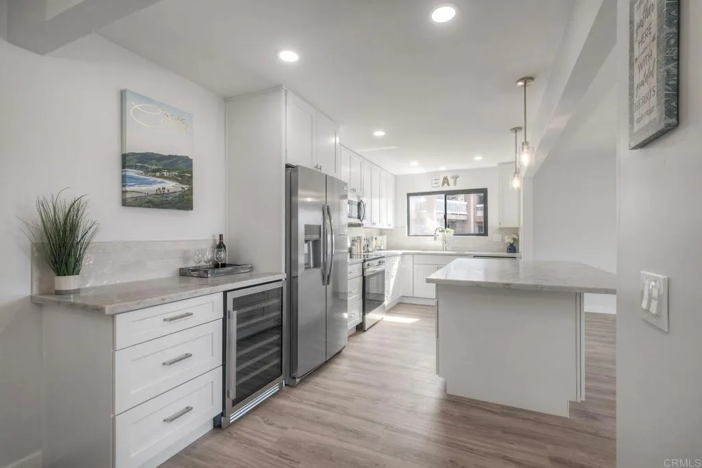Welcome Home to Coastal Living! Experience the best of Carlsbads coastal charm in this beautifully remodeled 2-bedroom, 2-bathroom home overlooking the serene Agua Hedionda Lagoon. Every detail has been thoughtfully designed to blend modern comfort with timeless style. Step inside to discover an open-concept kitchen and living area, where natural light pours through sliding glass doors that lead to your private balconythe perfect spot to savor your morning coffee or unwind with a glass of wine while watching the sunset over the Pacific. The gourmet kitchen features all new stainless-steel appliances, soft-close cabinetry, quartz countertops, and a spacious center island ideal for cooking or entertaining. A wine fridge and wet bar make it easy to enjoy casual evenings at home or host friends and family in style. The inviting living room showcases a new modern fireplace and abundant built-in storage, creating a cozy yet functional gathering space. Retreat to the primary suite, featuring a custom closet organizer and a spa-inspired bathroom with beautiful floor-to-ceiling tile, creating a peaceful, spa-like retreat. A second bedroom and bath provide comfort and flexibility for guests or a home office. Additional highlights include an in-unit laundry closet for everyday convenience, gated entry and gated garage access, and an elevator that makes living on the second floor even better than the first. Enjoy outdoor adventures just steps away with a beach access point only a block from your door, perfect for lounging by the lagoon. The community also offers an available boat dock