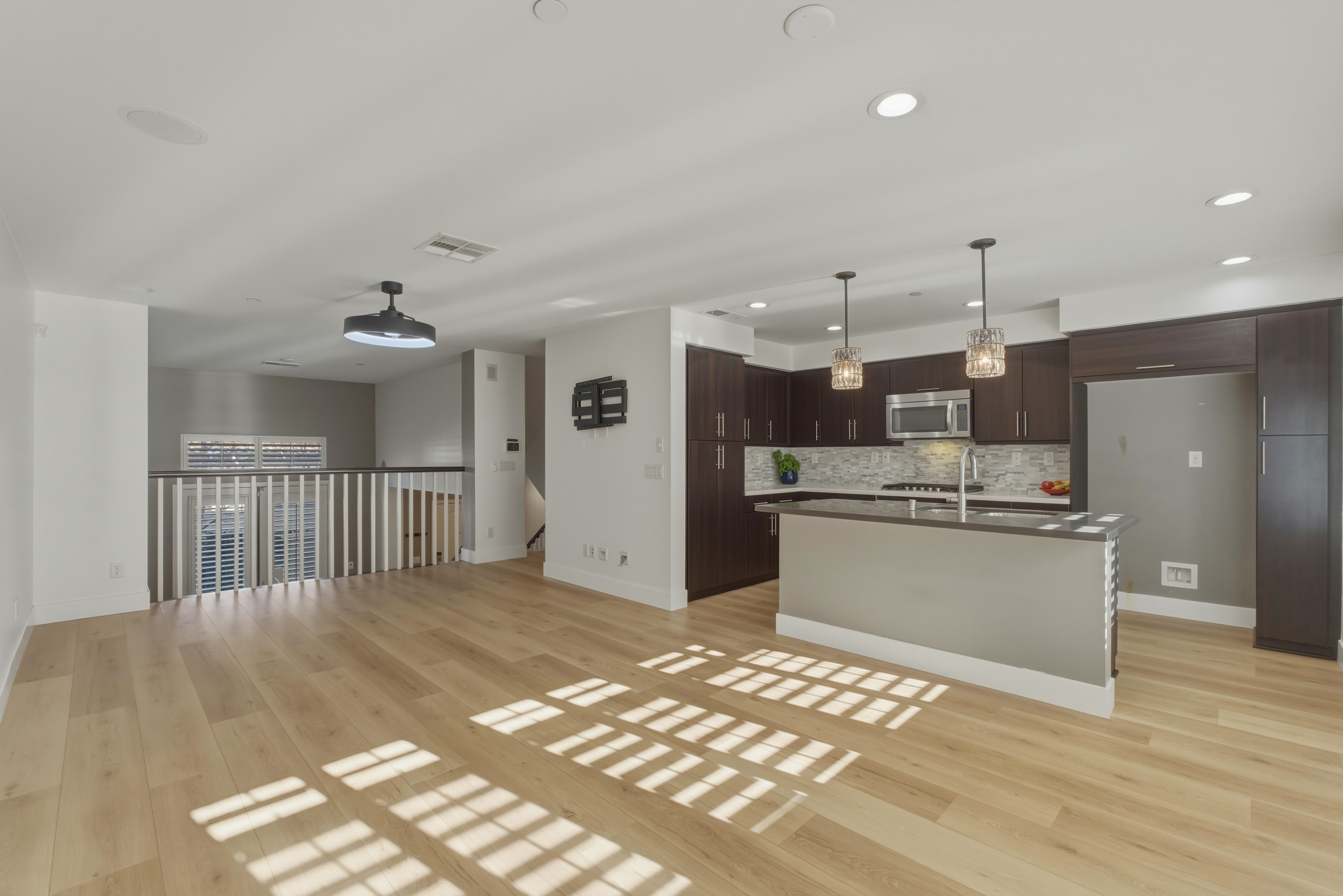 This stylish, contemporary townhome is turn-key and fabulous! 3 Bedrooms, 2.5 Baths, approximately 1500sf. Enter the living room, featuring vaulted ceilings, a fireplace, and double doors leading to the spacious patio. The home offers laminate luxury floors in the living areas, plantation shutters, and designer upgrades throughout. The gourmet kitchen features quartz counters with a stacked stone backsplash, a large island, and Energy Star appliances, including a gas range. The thoughtful floor plan offers multiple living areas, with a large dining area adjacent to the kitchen, a family room, a powder bath, and a separate living room. The spacious primary suite has a walk-in closet with a custom California closet, custom paint throughout, a spacious 2-car garage with epoxy flooring, and a Tesla universal charger.