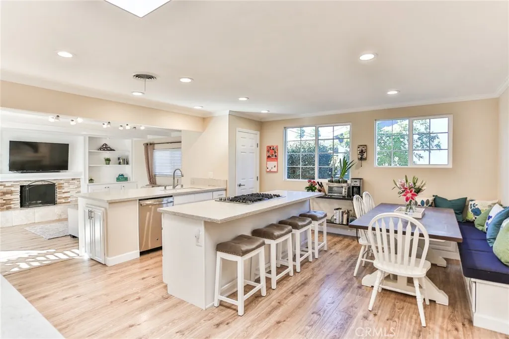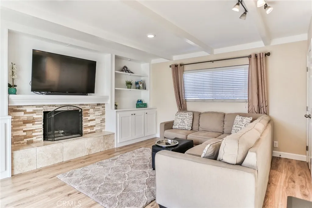 Wonderful 4 bedroom remodeled home. This home is equipped with a custom kitchen that includes Quartz countertops, recessed lighting and it's open to the family room and kitchen nook. It is quite ideal for entertaining. Other features include newer flooring throughout, remodeled bathrooms, newer paint and areas for storage. The family/living room has slider doors exiting to the private backyard/patio. The nice size front yard is enclosed with picket fencing and has a concrete bench and patio area too. This home is close to schools, park, freeways, Bella Terra, restaurants and more. It's just minutes to the ocean too. Home has a nice layout and a great front and back yard for all to enjoy.