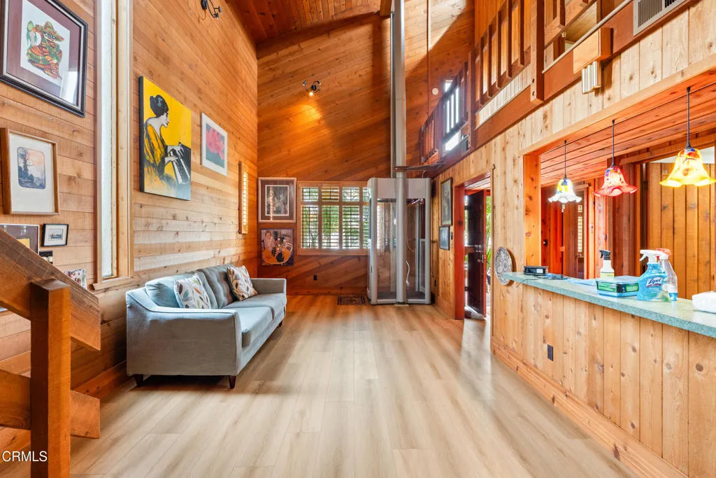 Great park & ocean views as well as soaring ceilings throughout. Spacious rooms. Office + stately fireplace. Cedar through out with a log cabin vibe. Brand-new kitchen & appliances. Updated bathrooms. Stylish great room upstairs with vaulted ceilings and wet bar. Secondary wet bar in loft. Outdoor commercial oven range, Elevator included. A unique property awaits the creative minded buyer