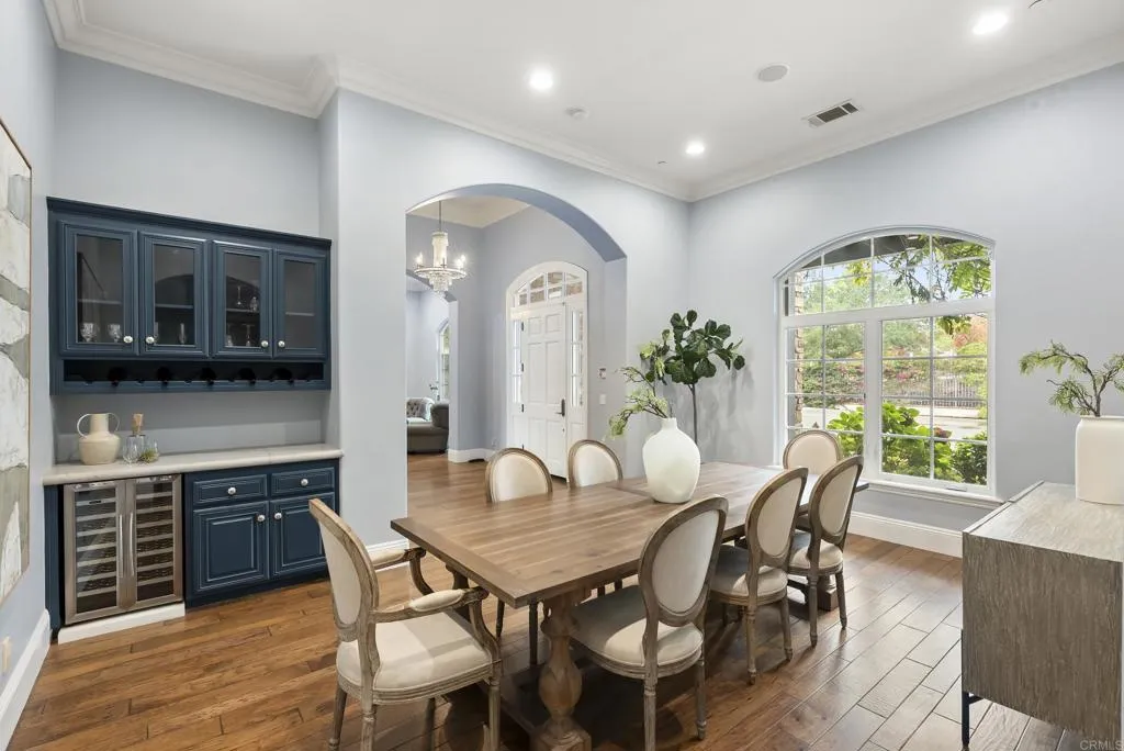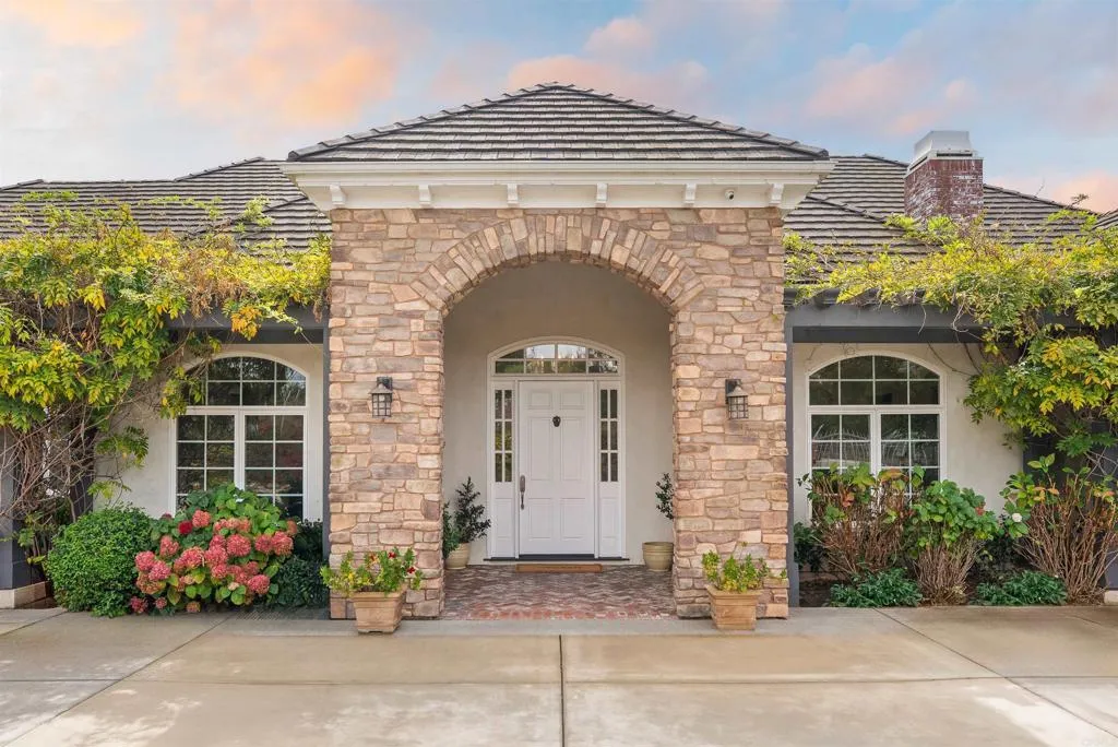 Set on nearly three acres in the rolling hills of Olivenhain, this custom single level estate blends timeless architecture with the relaxed beauty of coastal California living. Encompassing approximately 5,000 square feet, the residence offers six bedrooms and four and a half bathrooms across a light filled open concept floor plan. Expansive and inspiring views overlook the world class golf course and clubhouse of The Bridges to the south and capture distant ocean views to the west. Designed for effortless flow, the interiors feature wide plank wood floors, high ceilings, and a soothing palette that complements the natural surroundings. The great room centers on a classic brick fireplace and opens to a covered loggia framed by arched stonework, perfect for entertaining or quiet evening gatherings. The kitchen combines elegance and function with marble countertops, custom cabinetry, a walk in pantry, and a breakfast area overlooking the gardens. A formal dining room and dedicated office provide thoughtfully designed spaces for work and connection. The primary suite offers a private retreat with direct access to the patio, a freestanding tub, and dual vanities. Five additional bedrooms provide comfort and flexibility for guests or family. Outdoors, the home embraces the California lifestyle with a pool and spa, shaded dining terraces, raised vegetable gardens, and an outdoor kitchen designed for alfresco dining and year round enjoyment. The grounds extend across approximately 2.59 usable acres with manicured lawns, fruit trees, and fenced paddocks suitable for up to five hors