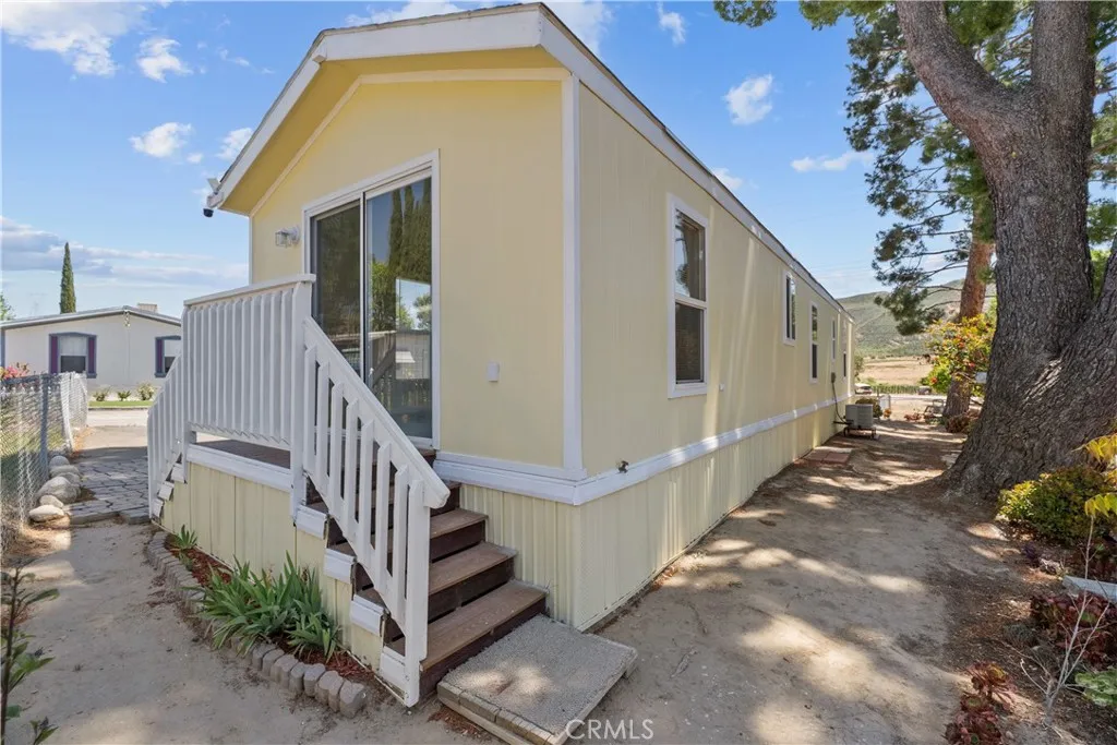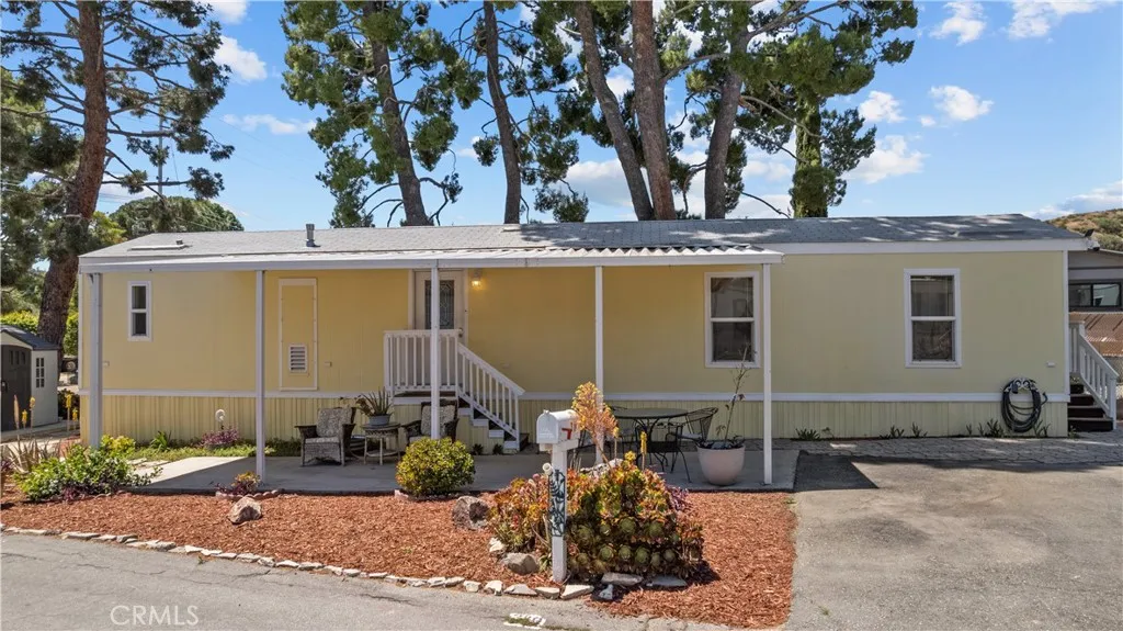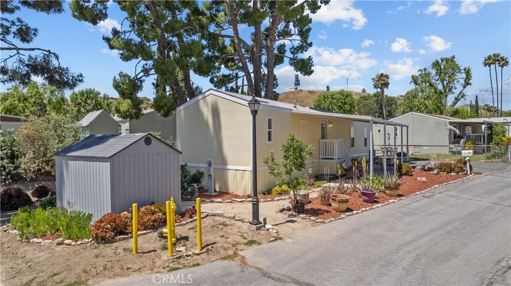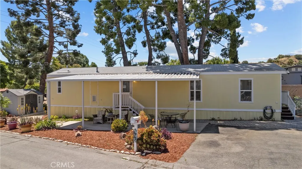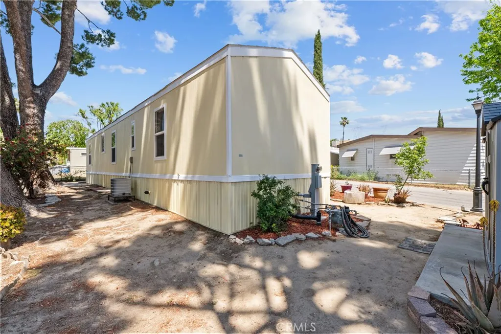 Welcome to this charming and well-kept 2 bedroom, 2 bathroom manufactured home located in the desirable Lily of the Valley community. Thoughtfully designed, this home makes great use of its space with a bright and comfortable layout, updated flooring, and fresh interior touches that give it a clean, modern feel throughout it truly feels like a brand new home. Enjoy year-round comfort with central AC and heating, along with new dual pane windows that enhance energy efficiency and natural light. The kitchen and laundry area feature beautiful wood cabinetry, while the bathroom has been tastefully updated with a white vanity, and tile backsplash. Situated on a desirable corner lot, the property offers a good-sized yard. The driveway features rare side-by-side parking, a hard-to-find feature in manufactured home communities. The exterior also includes a covered patio, landscaped front area, and a storage shed. The community offers great amenities including a playground and a conference room. A great opportunity for a buyer looking for an affordable home in a well-maintained community with convenient access to local shopping, dining, and freeway access.