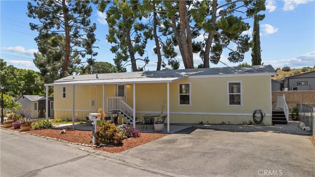 Welcome to this charming and well-kept 2 bedroom, 2 bathroom manufactured home located in the desirable Lily of the Valley community. Thoughtfully designed, this home makes great use of its space with a bright and comfortable layout, updated flooring, and fresh interior touches that give it a clean, modern feel throughout it truly feels like a brand new home. Enjoy year-round comfort with central AC and heating, along with new dual pane windows that enhance energy efficiency and natural light. The kitchen and laundry area feature beautiful wood cabinetry, while the bathroom has been tastefully updated with a white vanity, and tile backsplash. Situated on a desirable corner lot, the property offers a good-sized yard. The driveway features rare side-by-side parking, a hard-to-find feature in manufactured home communities. The exterior also includes a covered patio, landscaped front area, and a storage shed. The community offers great amenities including a playground and a conference room. A great opportunity for a buyer looking for an affordable home in a well-maintained community with convenient access to local shopping, dining, and freeway access.